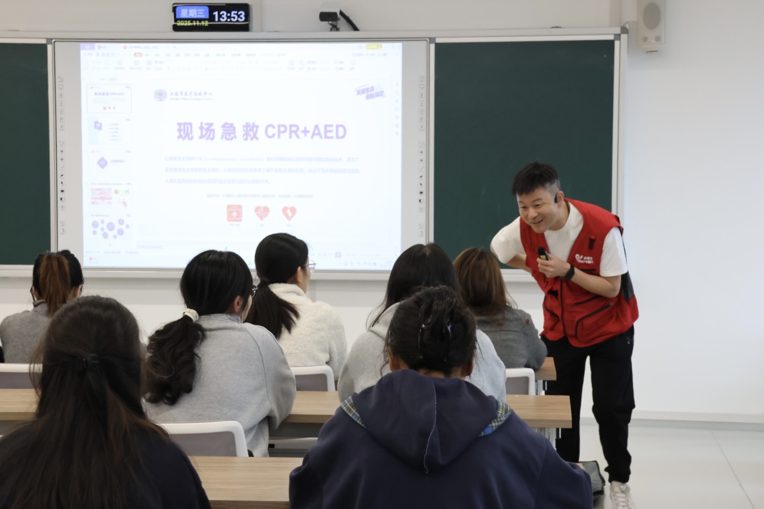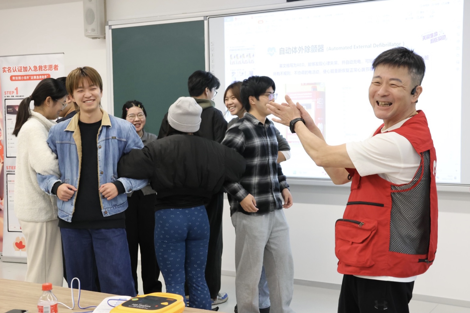 AED教学则突出“听机指挥、简单高效”。邓老师现场演示如何开机、贴放电极片、连接主机,并提醒“在AED分析心律时务必停止触碰患者”。同学们分组有序练习,反复确认电极片的正确粘贴位置。
