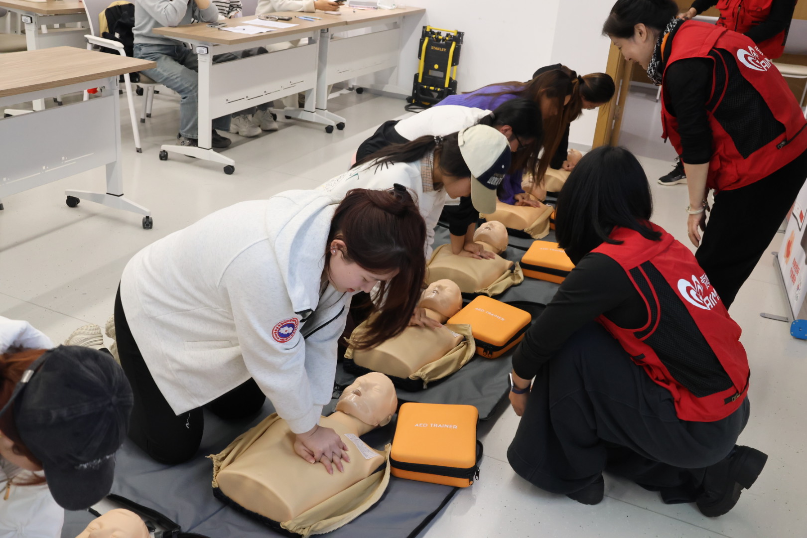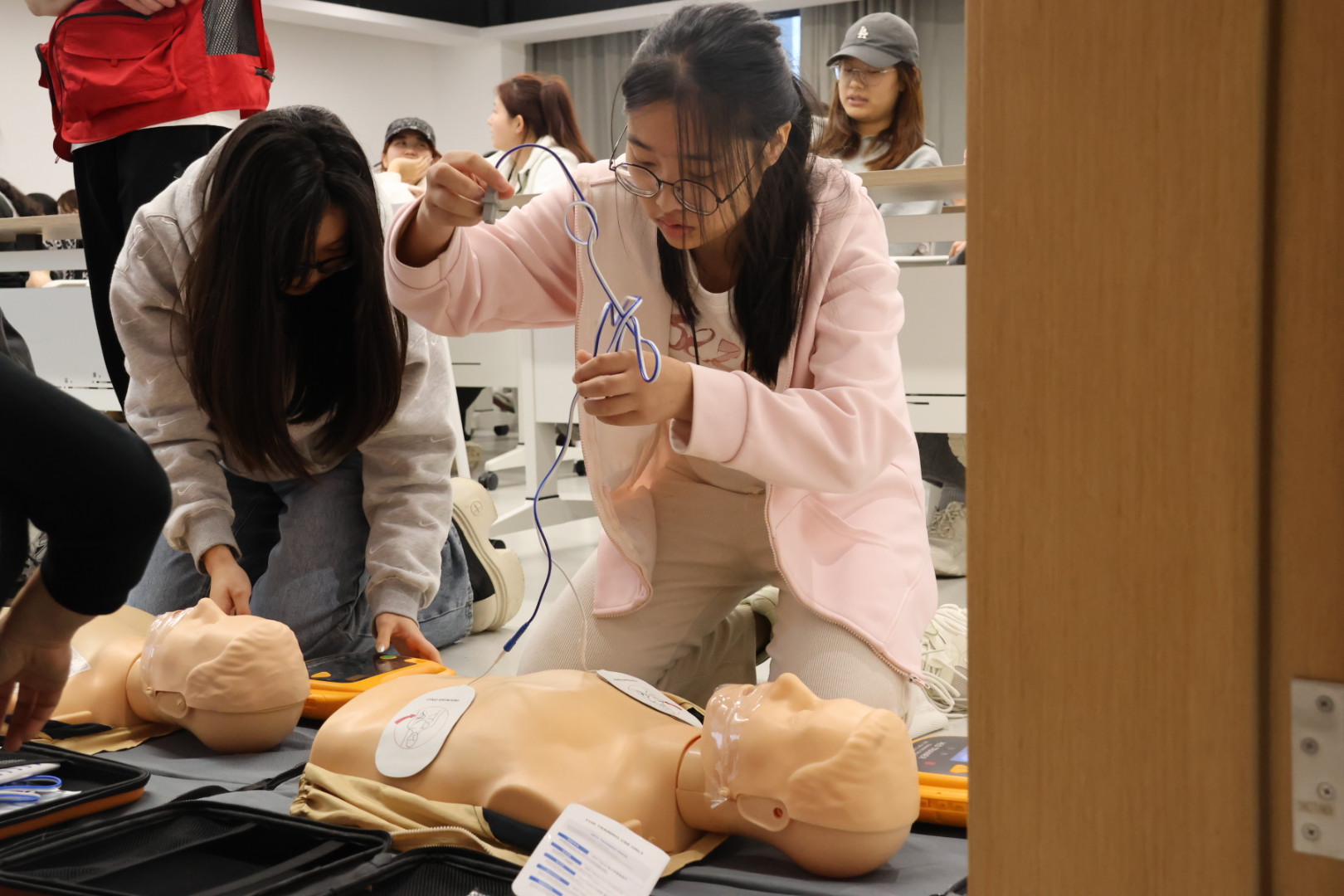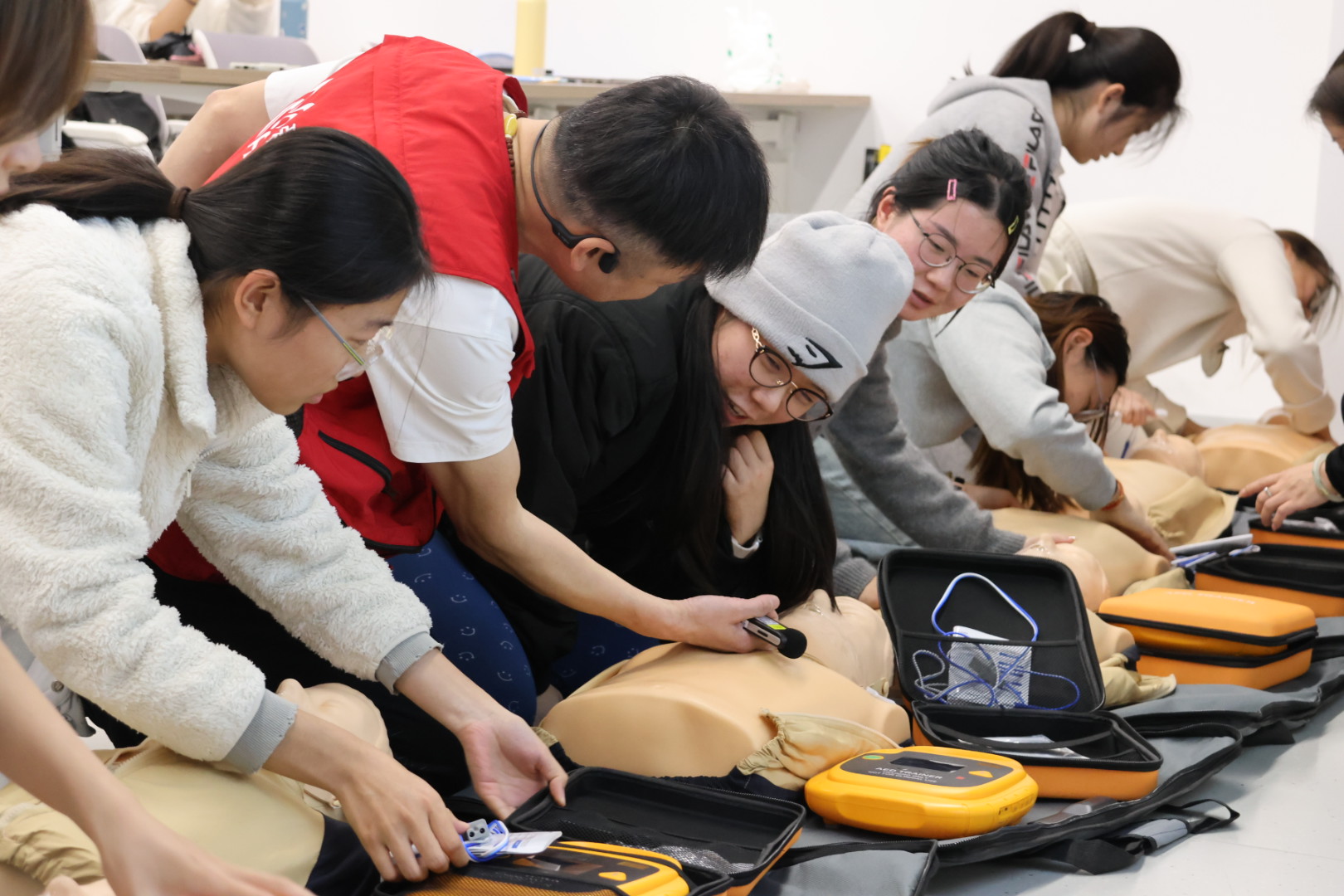 在CPR实操环节,同学们重点练习了持续胸外按压。导师反复强调“用力压、快速压、充分回弹”,按压深度成人应达到5至6厘米,频率维持在每分钟100至120次。训练过程中,多位同学通过按压反馈装置看到指示灯由红转绿,标志着按压力度与频率达到有效标准,直观体验到“有效按压”的实际感受。