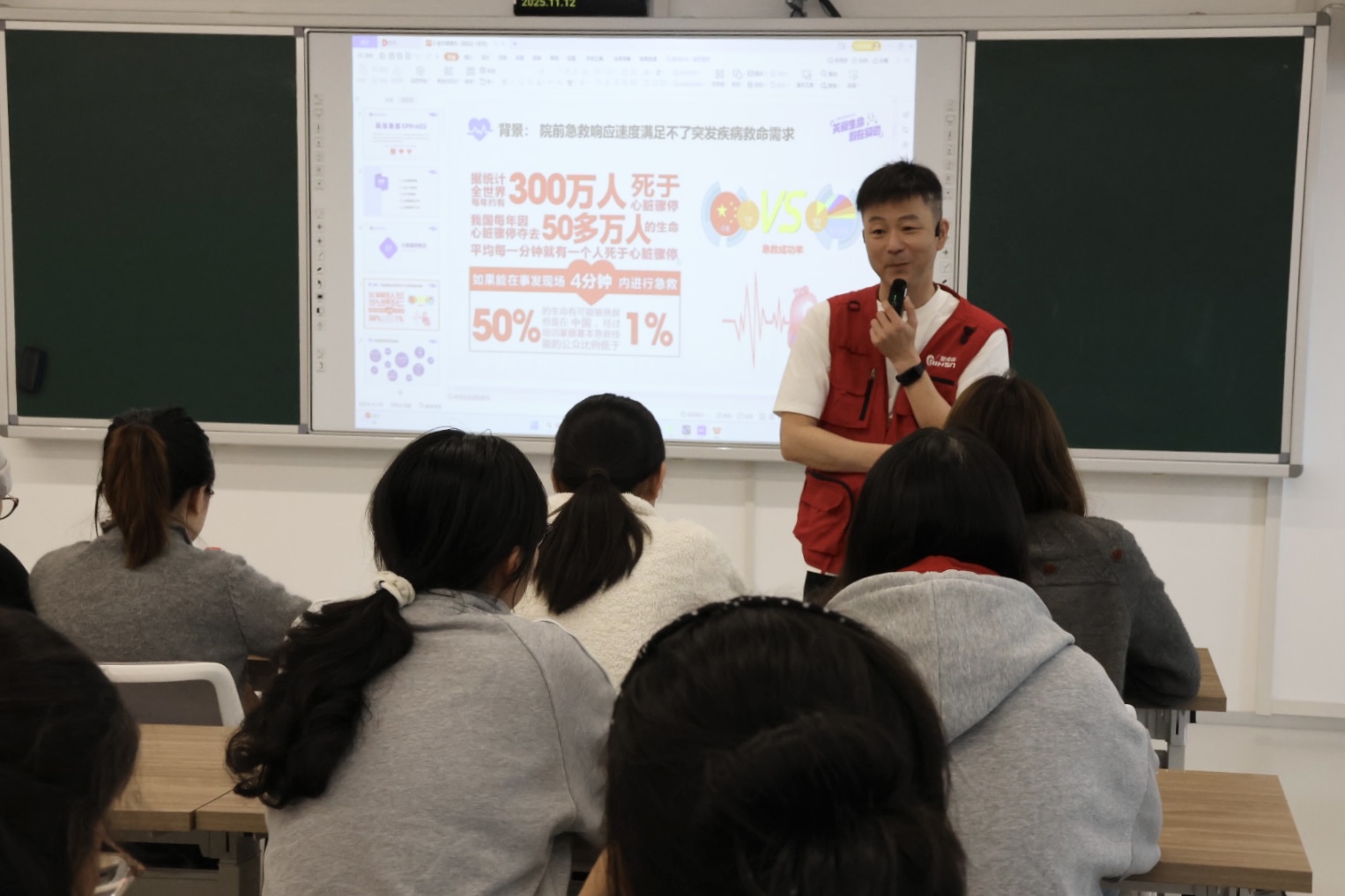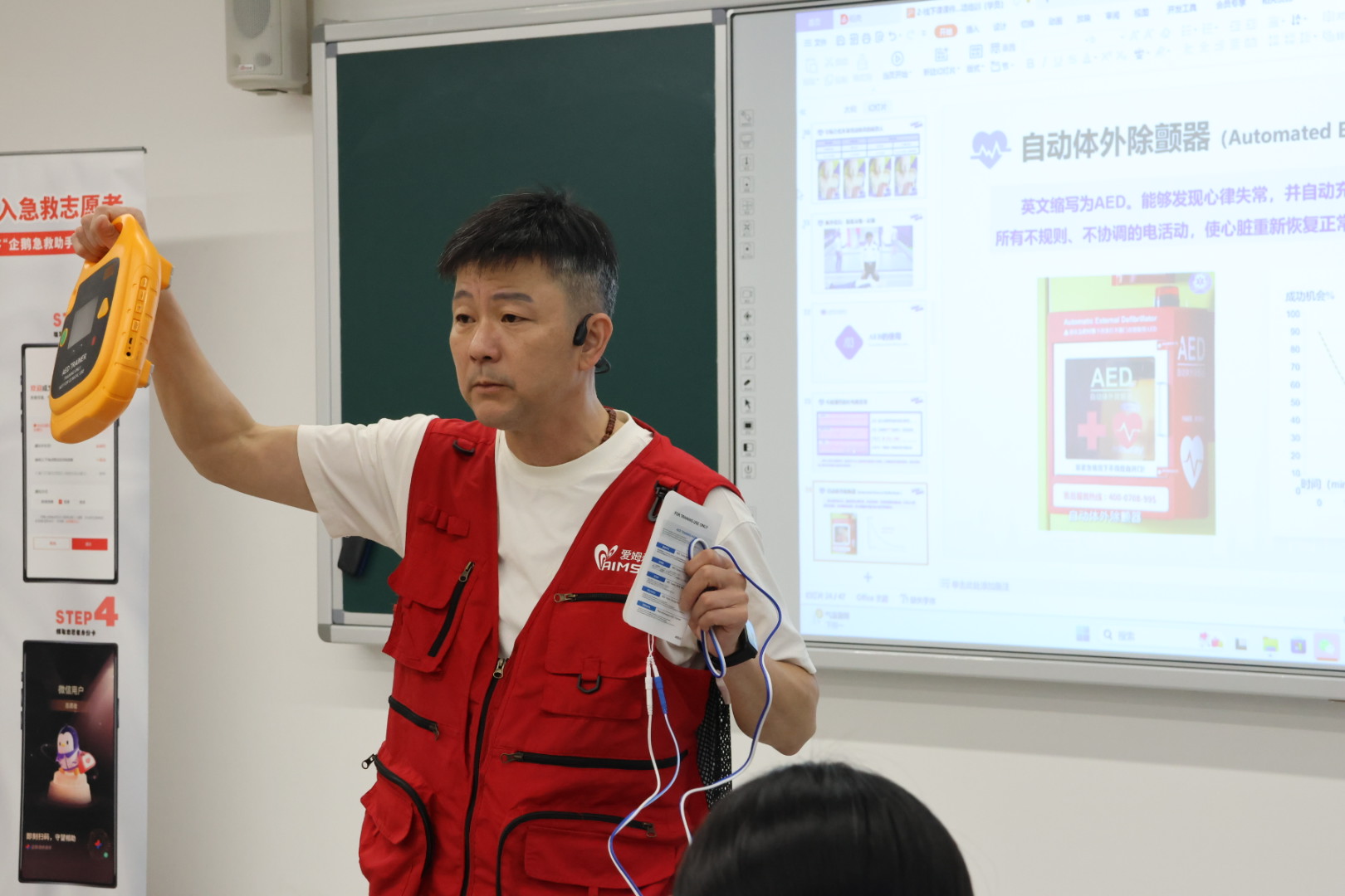课程由美国心脏协会AHA导师、120AED急救导师邓毅敏主讲。他系统讲解了心脏骤停的识别、心肺复苏的标准流程以及AED的使用方法,明确表示CPR与AED配合使用是挽救心搏骤停患者的关键。