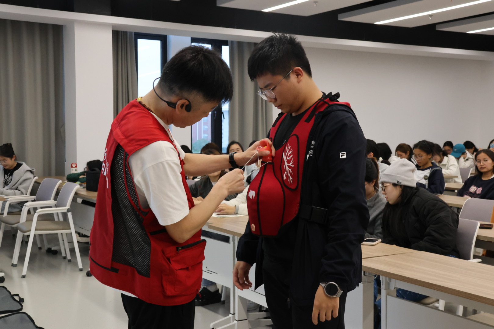 针对异物梗阻的处理,培训设置了“冲击体验”互动环节。邓老师现场邀请同学上台,模拟在噎住情况下进行腹部快速压迫,特别提醒大家不应机械记忆海姆立克,要理解其原理是制造人工气流,并指导大家在真实急救中如何根据患者体型与反应灵活调整手法。
