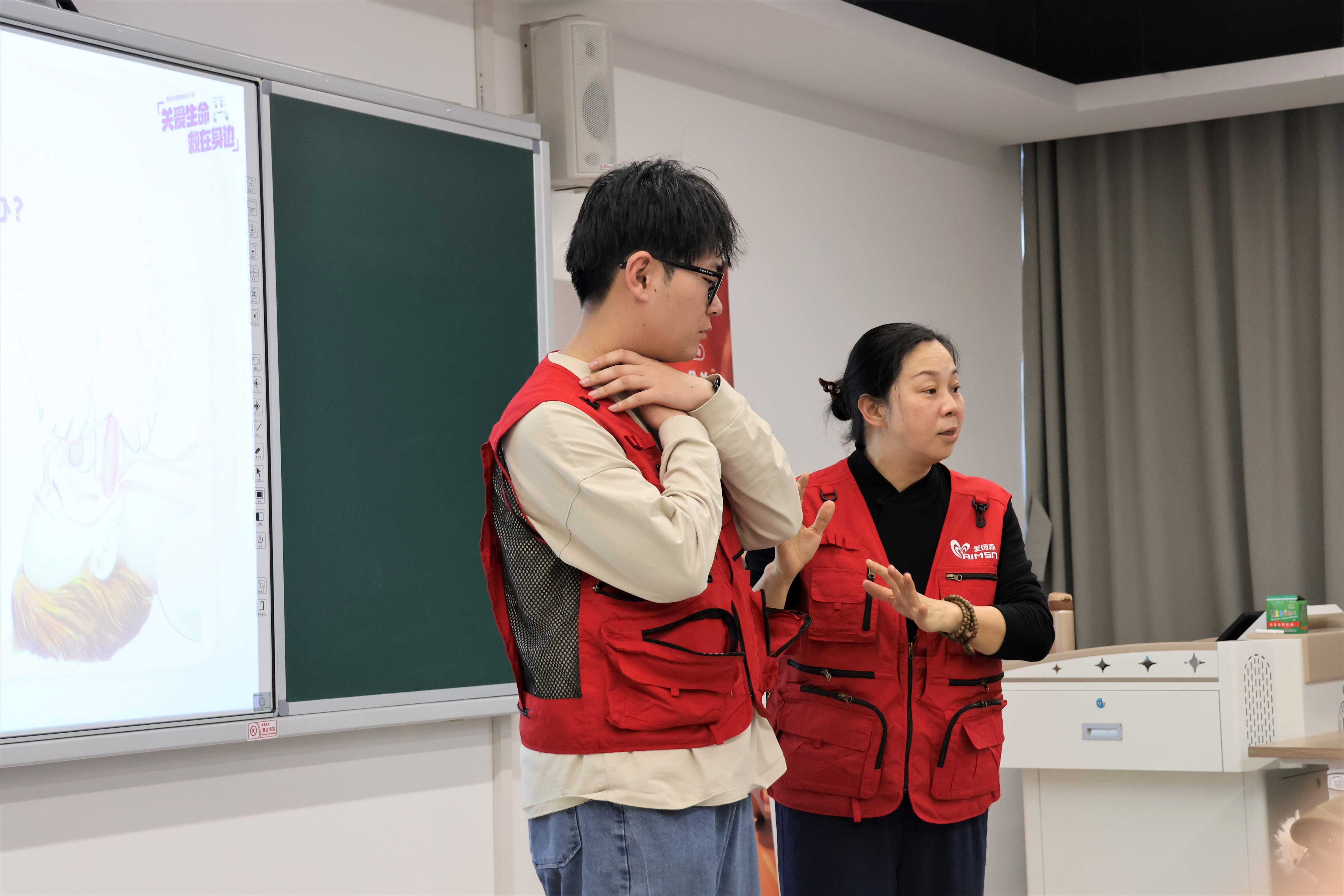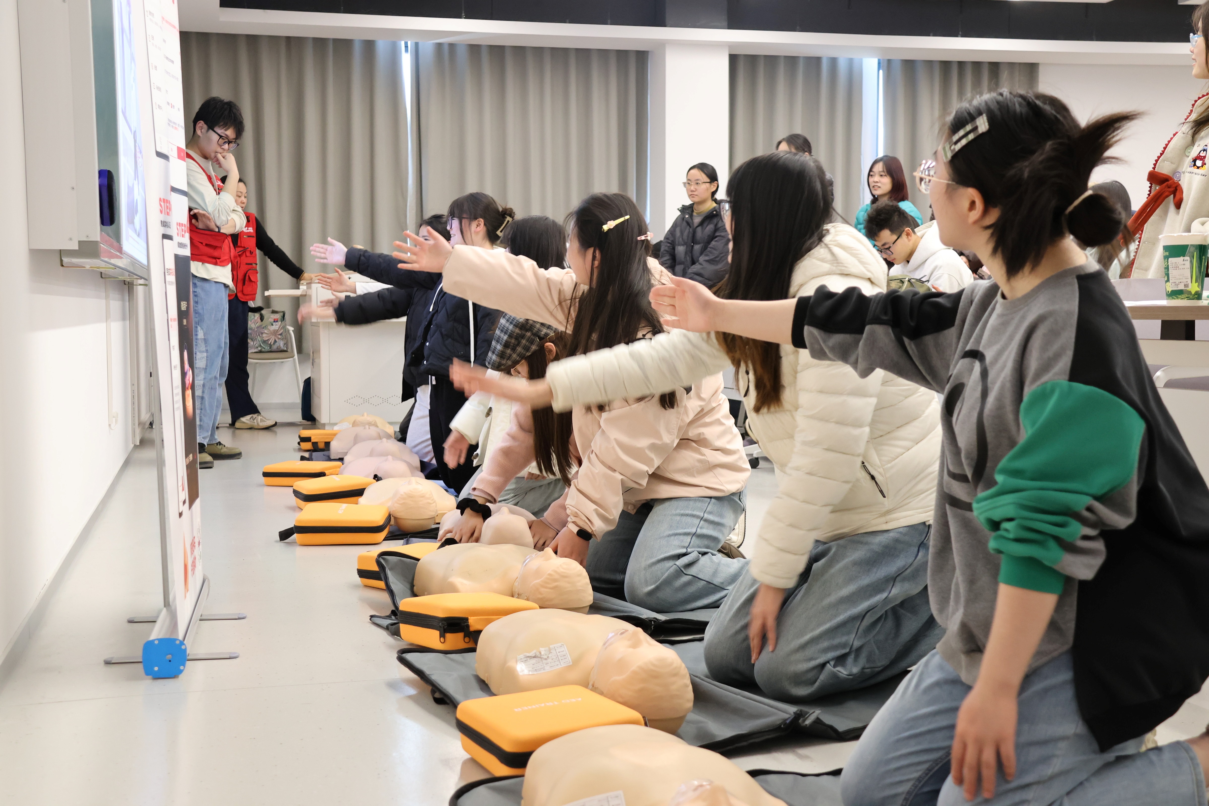 课程由上海市5分钟社会急救志愿服务公益项目导师主讲,通过“叫叫CABD”口诀为线索,系统讲解成人基础生命支持操作流程,涵盖现场环境评估、意识判断、呼救求助、胸外按压、开放气道、人工呼吸及AED使用等环节。同时,讲师结合特殊情境补充讲解气道异物梗阻、溺水、孕妇及儿童等群体的急救要点。理论讲解过程中穿插知识问答,学员们踊跃互动,在问答中巩固了按压深度频率、AED使用时机等核心知识点,现场气氛热烈。